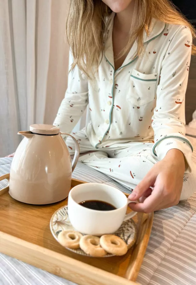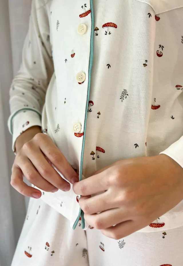 Nossos pijamas são confeccionados em malha viscolycra premium*, que proporciona uma sensação de maciez e conforto e respirabilidade. Possui gola com lapela, fechamento por abotoamento frontal e detalhamento de viés contrastante que dão charme e elegância à peça.